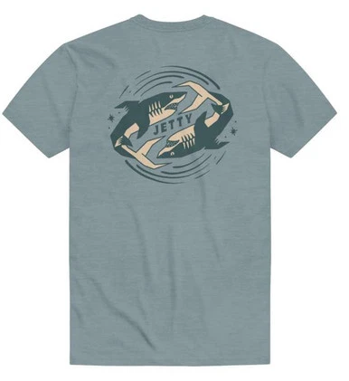 The Jetty Backflip Tee is a short sleeve shirt made with comfortable 60% cotton/40% polyester material. It features a Jetty shark design across the back with smaller version on the front. The design is pigment dyed printed with water based discharge ink. This tee is ultra soft to the touch.