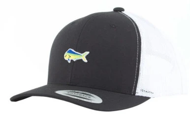 The Salty Crew Happy Fish Retro Trucker hat is a trucker style hat featuring a Mahi fish across the front.