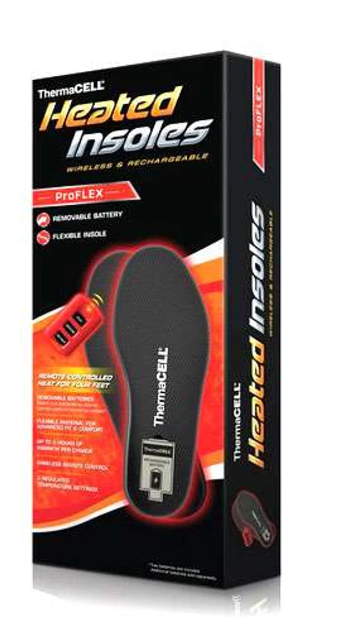 ThermaCELL ProFLEX Heated Insoles use state-of-the-art wireless thermal technology with a built-in thermostat. They will keep your feet warm without getting hot to the touch and making them sweat. It’s the best way to keep your feet warm while hunting, fishing, or working outdoors. The ProFLEX insole offers more comfort than the original heated insoles, utilizing a flexible polyurethane insole material, resilient poron battery cover cushion, and removable, rechargeable battery. These heated insoles offer remote operation with no wires or external batteries. They provide at least 2,500 hours of use or 4 winters of heavy use. The insoles are easy to use, just adjust the temperature using the wireless remote control to the setting of your choice, no heat (stand by), medium (100 degrees Fahrenheit), or high (111 degrees Fahrenheit).